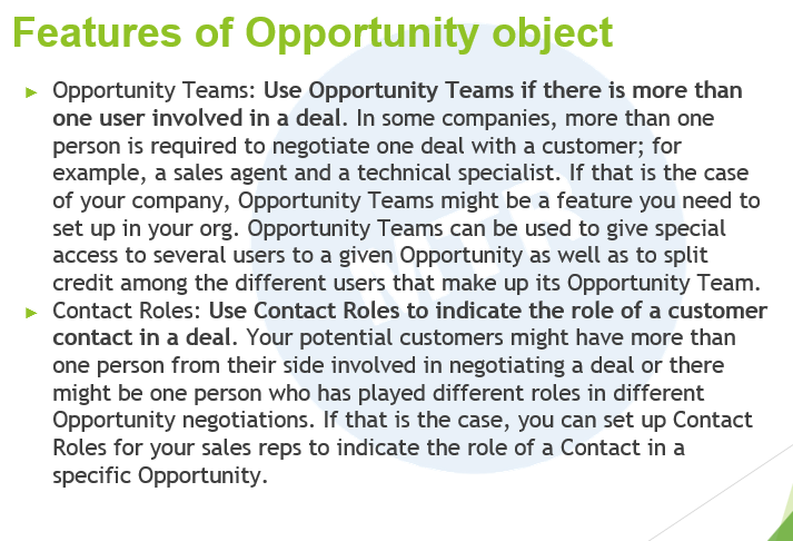 거래에 여러 사용자가 관여하는 경우 Opportunity Teams 기능을 사용합니다. 일부 회사에서는 한 고객과의 거래를 협상하기 위해 여러 사람이 필요할 수 있습니다; 예를 들어, 영업 담당자와 기술 전문가가 필요한 경우입니다. Opportunity Teams는 특정 Opportunity에 대한 여러 사용자에게 특별한 접근 권한을 부여하고, Opportunity Team을 구성하는 여러 사용자 사이에 크레딧을 분배하는 데 사용될 수 있습니다.