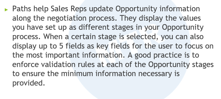 Sales Reps가 협상 과정에서 Opportunity 정보를 업데이트하는 데 도움을 줍니다. Paths는 Opportunity 프로세스에서 설정한 다양한 단계를 표시합니다. 특정 단계가 선택되면, 사용자에게 가장 중요한 정보에 집중할 수 있도록 최대 5개의 필드를 주요 필드로 표시할 수 있습니다. 좋은 사용 예는 각 Opportunity 단계에서 최소한 필요한 정보가 제공되도록 하기 위해 Validation Rules을 적용하는 것입니다.