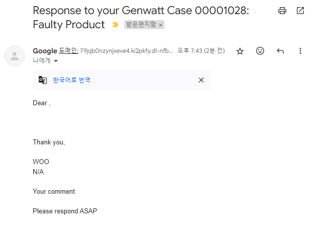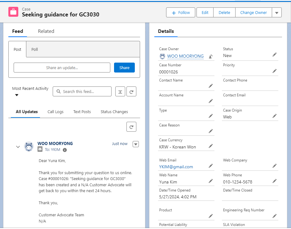 이후 레코드를 조회해보면 유저가 입력한 내용대로 새로운 Case 레코드가 생성되고 디폴트 응답 메일이 발송된 것을 확인할 수 있습니다.