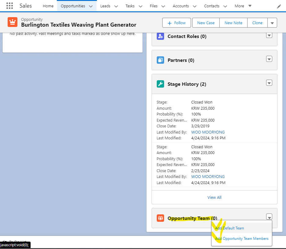 이후 개별 레코드를 조회해보면 Related Lists에서 팀을 조회할 수 있고 디폴트 팀을 추가하거나 개별 멤버를 추가할 수 있습니다.