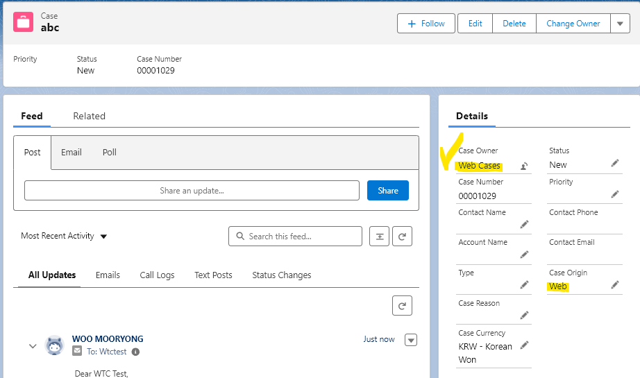 제출한 케이스가 생성되었고 Case Origin이 Web임에 따라 Case 소유자가 Rule에서 정의한대로 Queue에 할당된 것을 볼 수 있습니다.