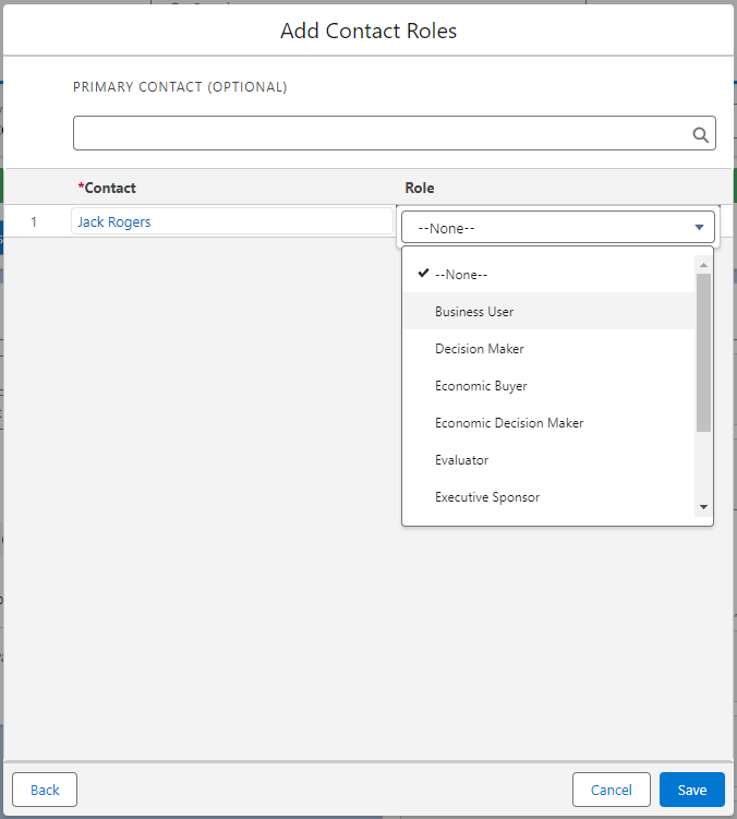 특정 레코드의 Related Lists에서 Contact Role을 조회할 수 있고 위와 같이 Add 버튼을 눌러 추가할 수 있습니다.