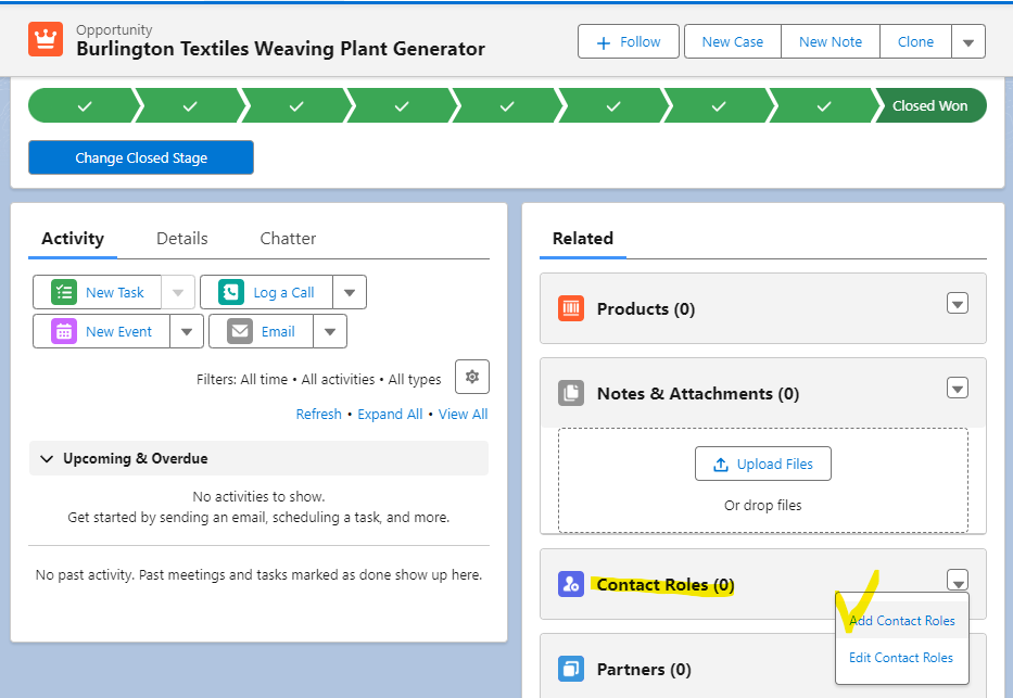 거래에서 고객 연락처의 역할을 나타내기 위해 Contact Roles를 사용합니다. 잠재 고객 측에서 거래 협상에 여러 사람이 관여하거나, 다른 Opportunity 협상에서 다양한 역할을 한 사람이 있을 수 있습니다. 이러한 경우, 영업 담당자가 특정 Opportunity에서 Contact의 역할을 나타내기 위해 Contact Roles를 설정할 수 있습니다.