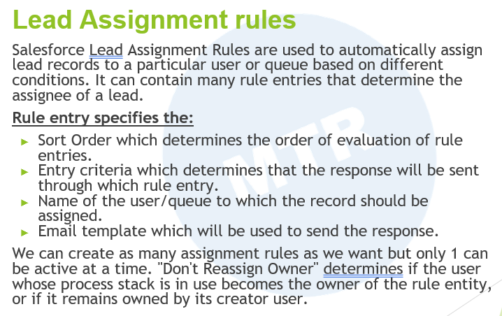 Salesforce의 Lead Assignment Rules(리드 할당 규칙) 은 다양한 조건에 따라 리드 레코드를 특정 사용자나 큐에 자동으로 할당하는 데 사용됩니다. 여러 규칙 항목을 포함할 수 있으며, 이들이 리드의 할당 대상을 결정합니다.