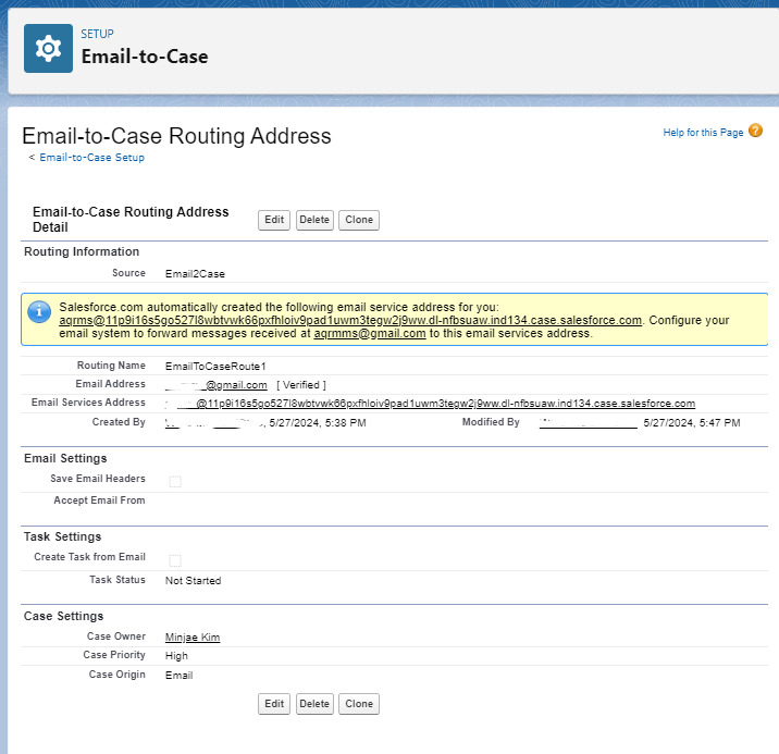 이후 새로운 Routing Address를 생성해야 합니다. 위와 같이 수신할 이메일을 기입하고 생성할 Case에 대한 옵션들을 지정하고 저장했습니다.