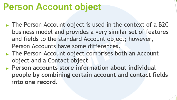 Person Account 객체는 B2C(기업에서 소비자로) 비즈니스 모델의 맥락에서 사용되며, 표준 Account 객체와 매우 유사한 기능 및 필드 세트를 제공하지만, 몇 가지 차이점이 있습니다.