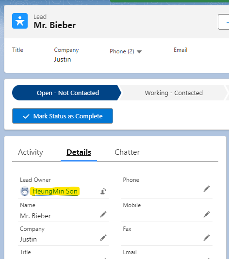 레코드를 조회해보면 입력한 정보로 새로운 Lead 레코드가 생성된 것을 볼 수 있습니다.