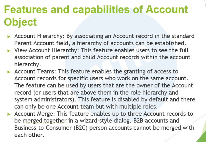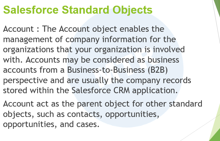 Account 객체는 contacts, opportunities, cases 등 다른 표준 객체의 부모 객체로 작용합니다.
