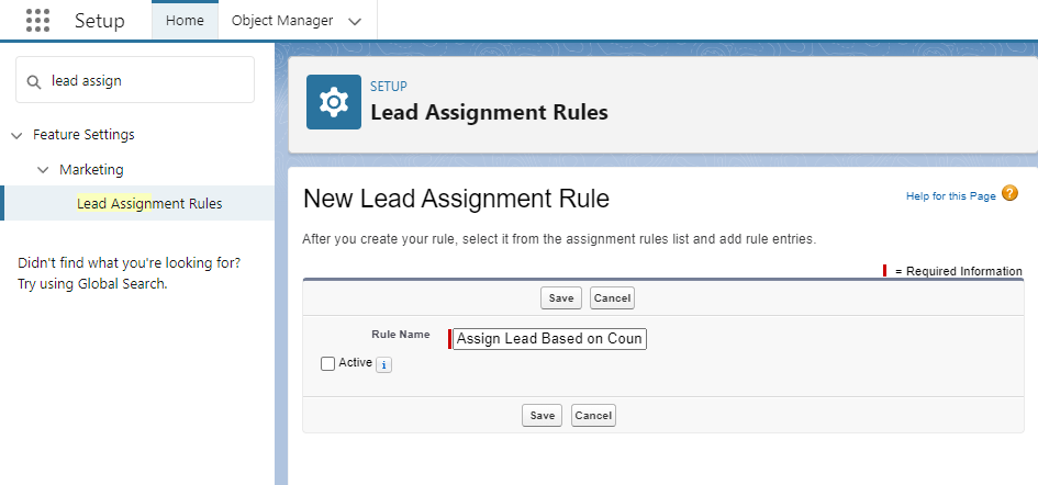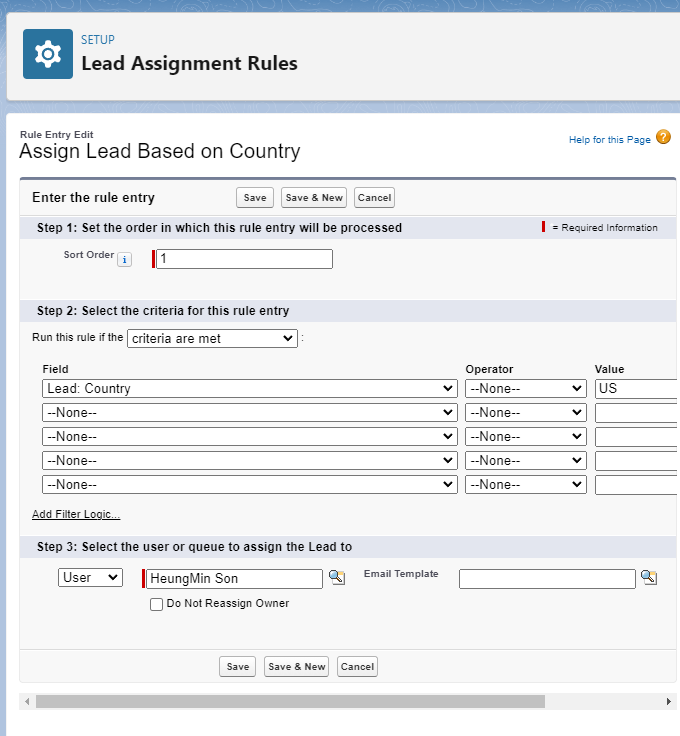 원하는 만큼 할당 규칙을 생성할 수 있지만, 한 번에 활성화할 수 있는 규칙은 하나뿐입니다. "Don't Reassign Owner(소유자 재할당 금지)" 옵션은 리드가 이미 할당된 사용자가 있을 경우 그 소유자를 변경하지 않는 옵션을 의미합니다.