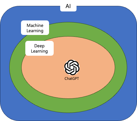 앞서 서론을 마무리 지으면서 AI에서 ChatGPT까지의 여정이라고 했는데, 이렇게 말하니 AI라는 학문이 시작되고, 그다음 다른 학문, 또다시 다른 학문으로 연결되었다는 듯한 어감이 있는거 같다. 하지만 실상은, AI라는 거대한 분야에서, 여러 기술의 세분화와 고도화를 통해 ChatGPT가 등장하게 된 것이다. 그 모습을 그림으로 표현하면,