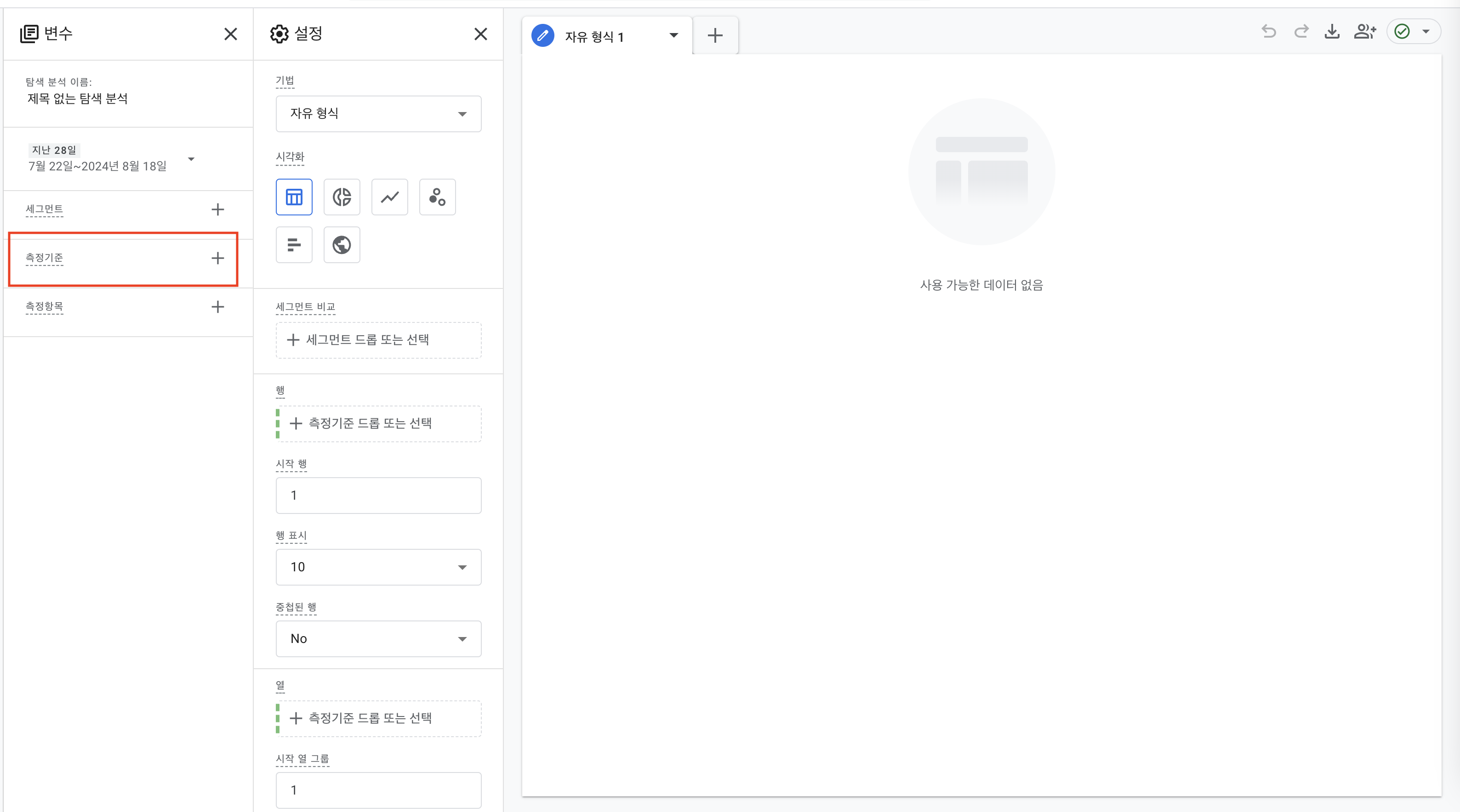 이렇게 되면 나중에 탐색 및 보고서 생성 시 저 측정항목에 key를 추가할 수 있으며 그렇게 추가된 측정기준은 탐색 형식에 따라서 행 또는 열에 들어갈 수 있다.