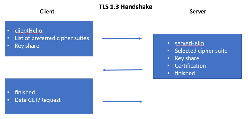 HandShake 과정이 2-RTT에서 1-RTT로 변경되어 지연이 줄어들었다. 그리고 이전 handshake한 두 대의 컴퓨터가 서로의 정보를 저장한 뒤, 향후 연결에 이전 키를 사용하는 것을 허용하는 0-RTT Resumption도 지원함으로써 속도가 향상되었다.