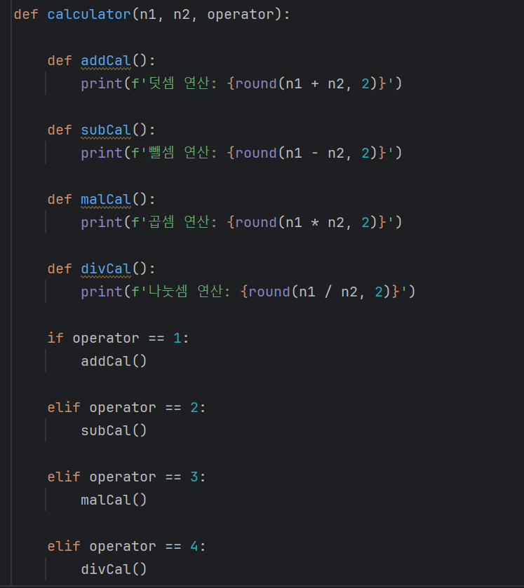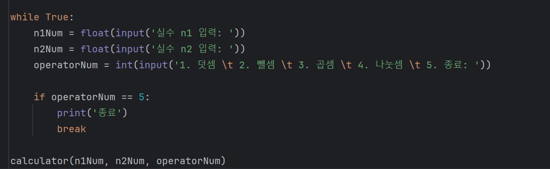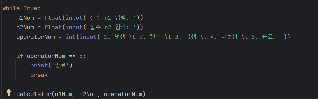ㄴ 주의점: while 루프 안에 calculator 함수를 호출해야 했는데 밖으로 빼서 연산 결과가 출력이 안 되는 오류가 났음.