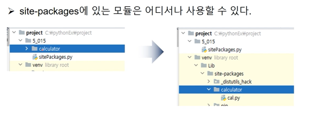 : site-packages 디렉토리에 있는 모듈은 범용 모듈이 된다. 어디서나 사용 가능. venv의 Lib에 있음.