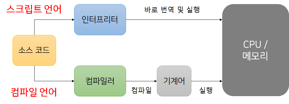 : 소스 코드 한 줄 한 줄을 바로 실행한다. 비유하자면 동시 통역.