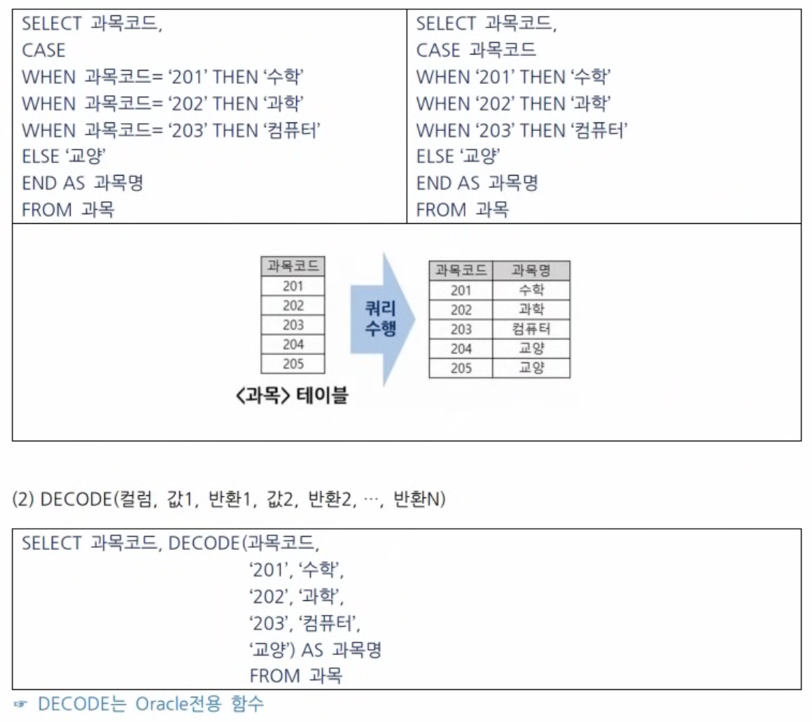 - NULLIF(컬럼1, 컬럼2) : 두 컬럼값이 같으면 NULL, 다르면 첫번째 값
