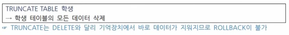 - 테이블 안의 모든 데이터를 삭제하지만, 테이블 구조는 유지 (스키마 유지)