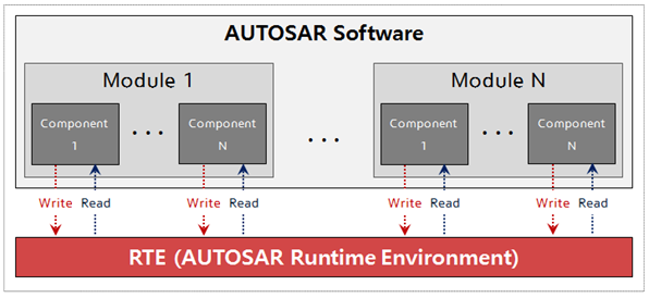 RTE(AUTOSAR Runtime Environment)는 컴포넌트 사이 혹은 그 외의 AUTOSAR 영역 사이에 통신 기능을 담당하면서 AUTOSAR 표준 인터페이스를 제공하는 계층으로 전달받은 데이터를 가지고 있다가 해당 데이터를 필요로 하는 모듈이 있다면 이를 전달해 준다.