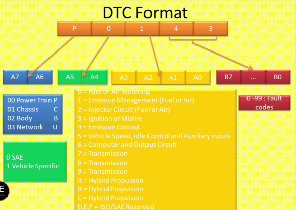 - DTC는 ISO 14229(UDS) 또는 SAE J2012 규격을 따르며, 일반적으로 4바이트(32비트)로 구성된다.