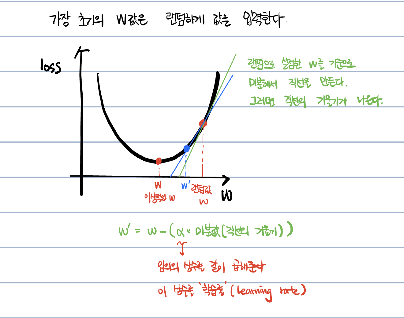 직선을 계속해서 고쳐가면서 어떤 직선이 우리의 값을 가장 잘 대표하는지를 찾아내는 과정. 정확히는 y 인자로 들어가는 가중치와 보정치의 값이 어떤 것이 가장 알맞은 값인지를 찾아가는 과정.