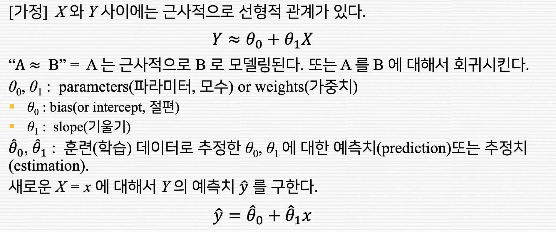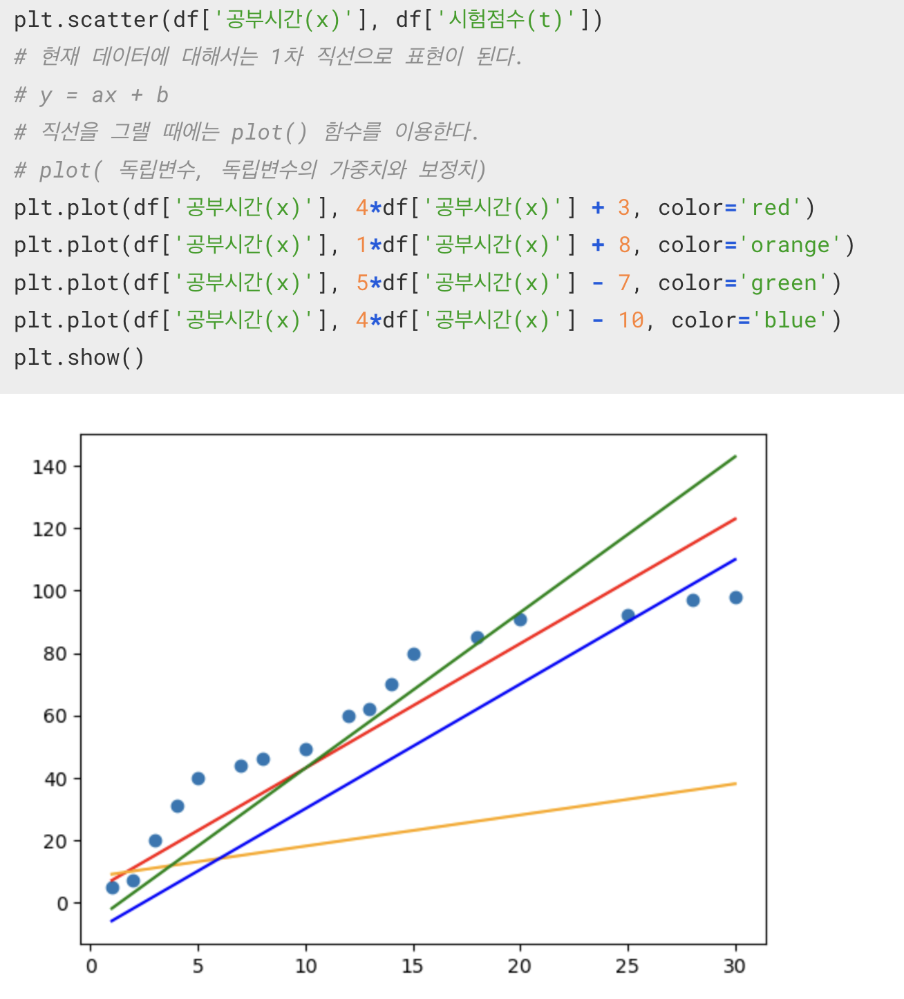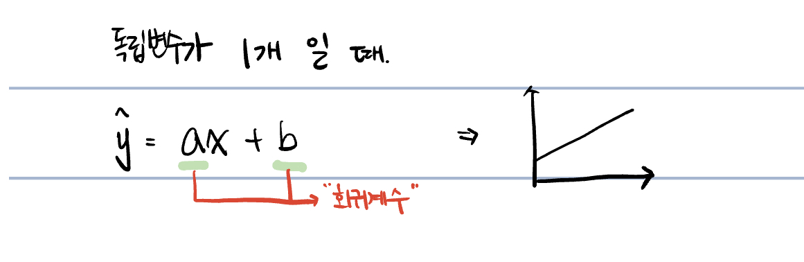 기본적으로 한 개의 독립변수와 한 개의 종속변수를 가지고 수식을 만들게 되면 1차원 직선의 수식이 나오게 된다.