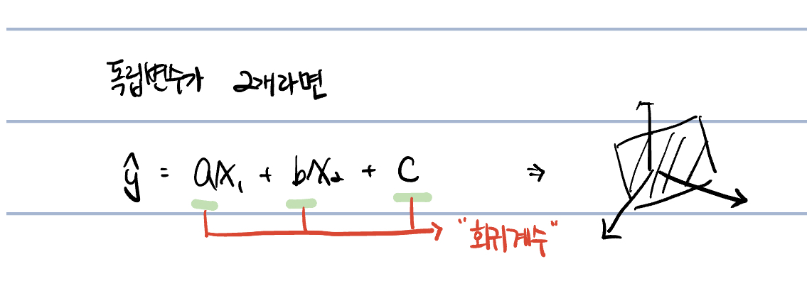 그런데 독립변수 혹은 종속변수의 갯수가 1개씩 늘어갈수록 2차원, 3차원으로 늘어나게 되고 수식 역시 면, 공간 등으로 바뀌게 된다.