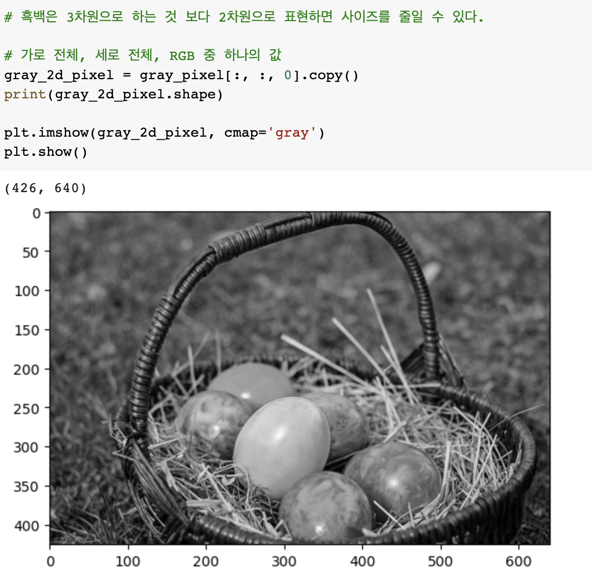 여기서 조금의 편법을 동원해서 흑백 이미지를 2차원으로 변경할 수가 있게 되는데, 어차피 color 의 RGB 가 모두 동일한 값이라면 color 부분을 RGB 를 쓰는 것이 아니라 하나의 스칼라 값(RGB의 평균)을 사용하는 것이다. 이를 통해 오른쪽 아래의 그림과 같이 가로x세로 에 하나의 값을 입력하는 2차원 형태로 만들 수 있게 된다.