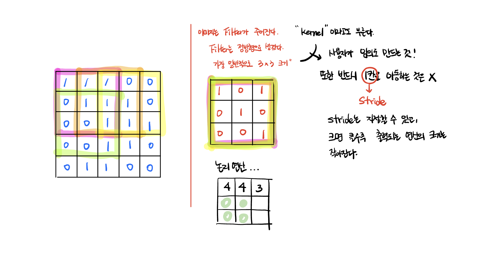 Stride는 지정이 가능하고, 이 값이 크면 클수록 출력되는 연산 값의 크기가 작아진다. 즉, 합성곱 연산을 통해 이미지의 크기가 줄어들게 된다.