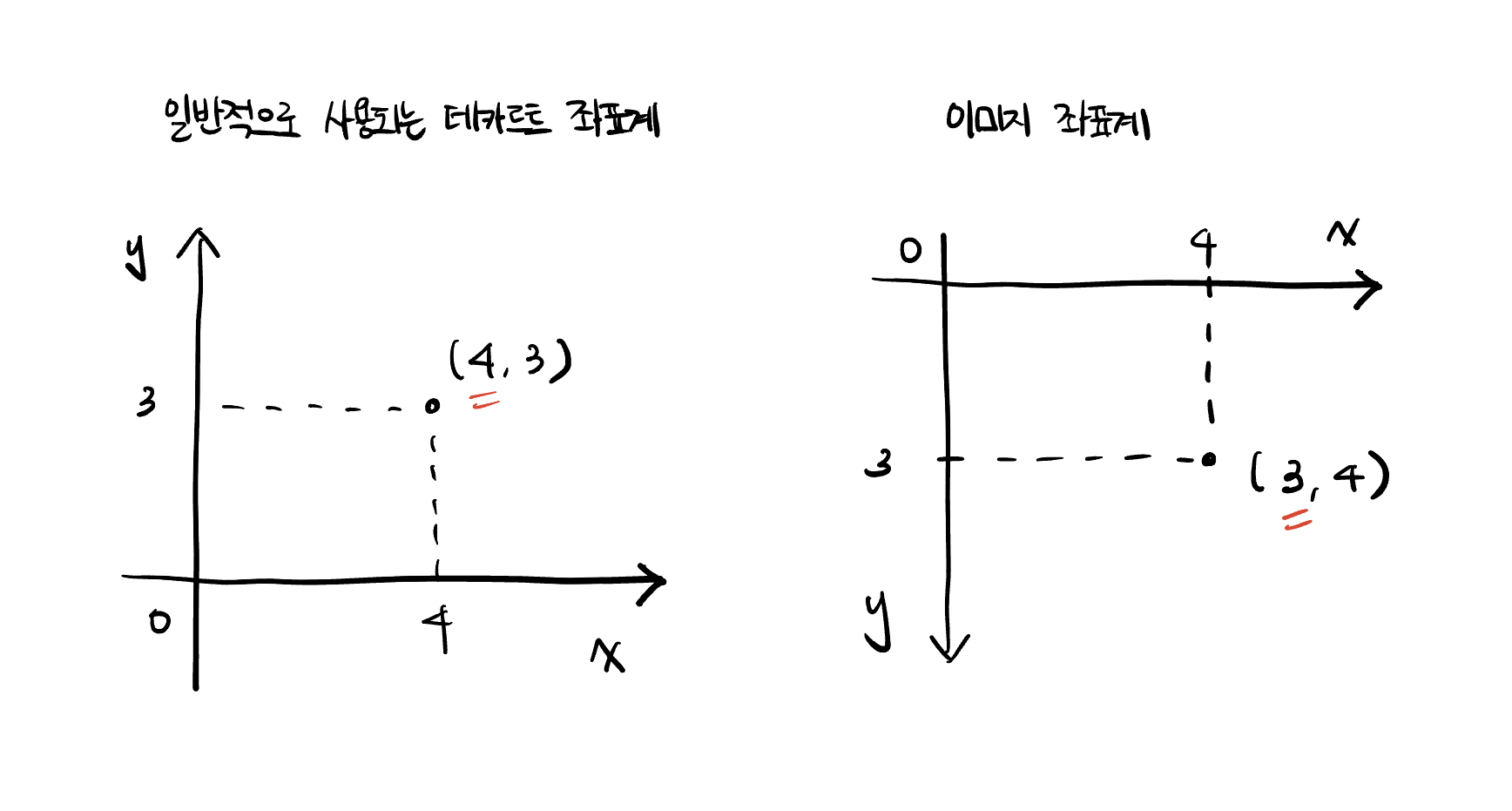 좌표계 : 이미지 좌표계가 별도로 존재한다.(일반적인 데카르트 좌표계를 표시하지 않는다) 이미지의 경우, 최상단의 왼쪽부터 시작해서 오른쪽/아래 방향으로 내려나는 좌표계를 사용한다.