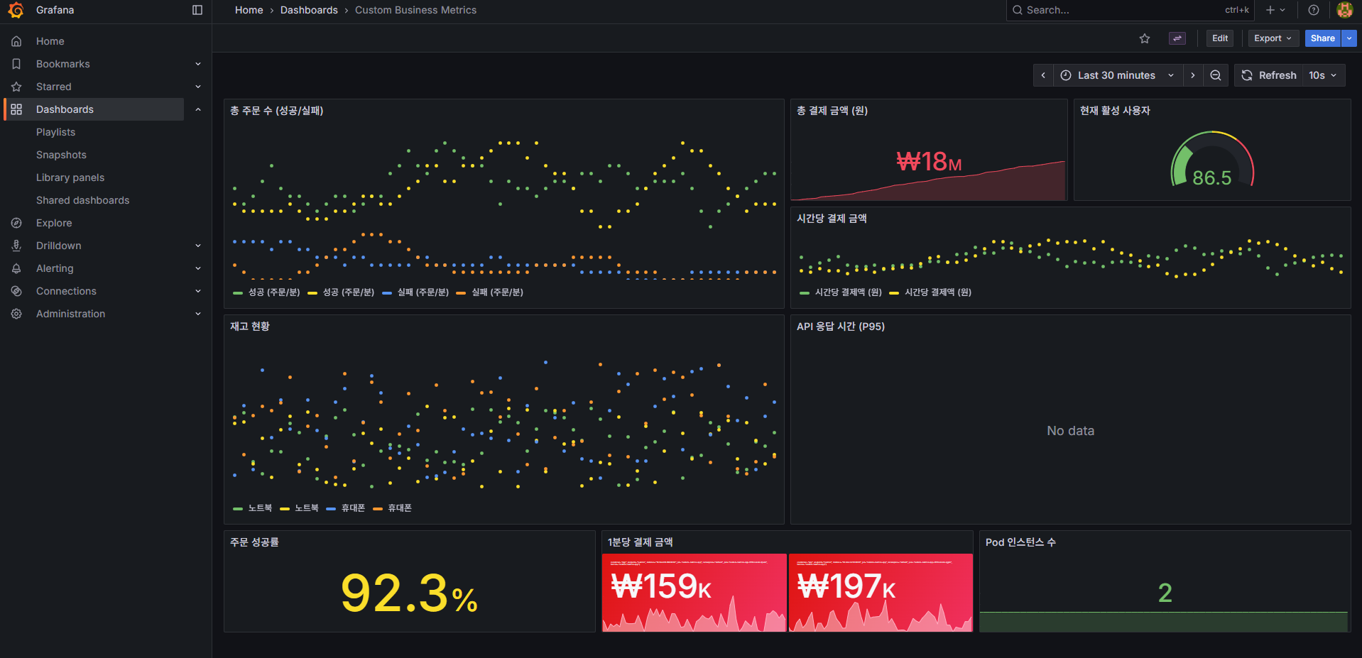 [이미지 7: Grafana Custom Metrics Dashboard 전체 화면 스크린샷]