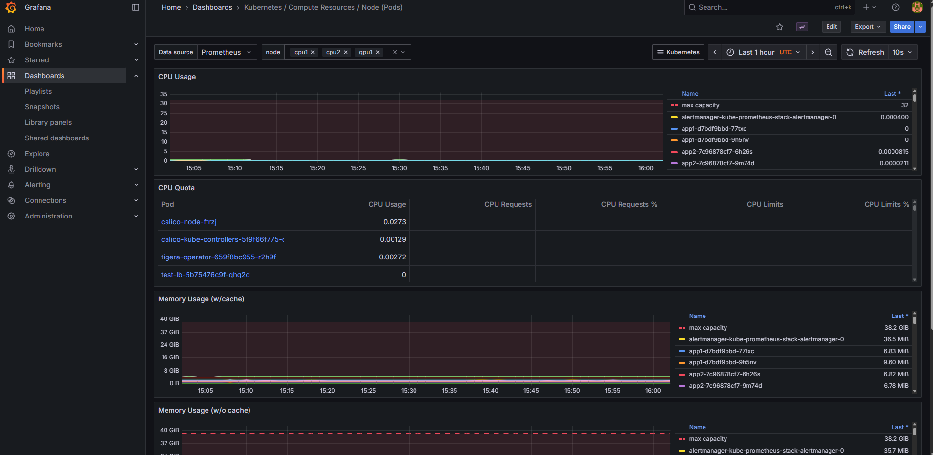 monitoring namespace가 CPU 25%, 메모리 40% 사용 (Prometheus 스택이 크다!)kube-system namespace는 안정적으로 CPU 10% 이하2. Node Exporter / Nodes