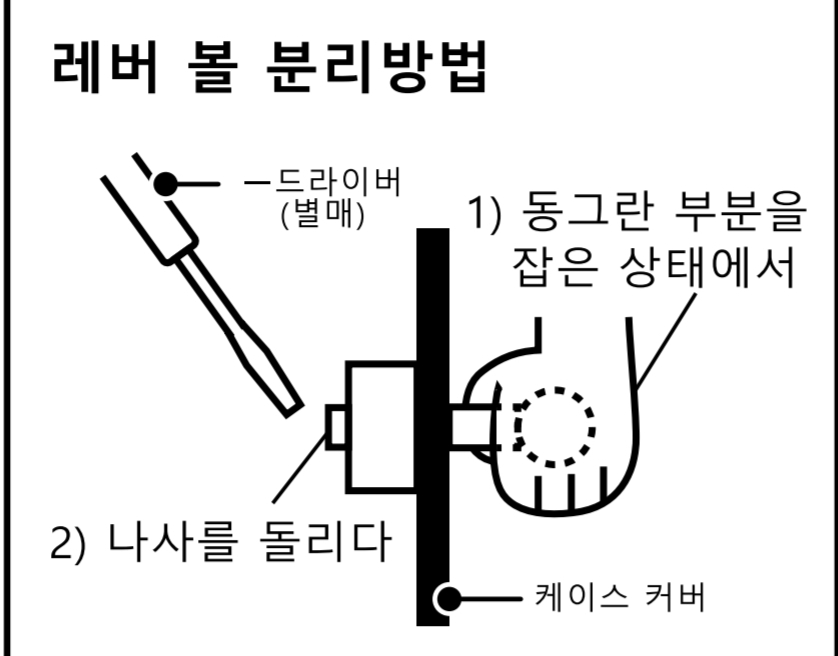 위 사진처럼 사탕레버의 동그란 부분(볼)을 잡은 상태에서 일자 드라이버를 레버 아래 막대기에 연결하고 돌려서 볼을 분리한다.