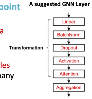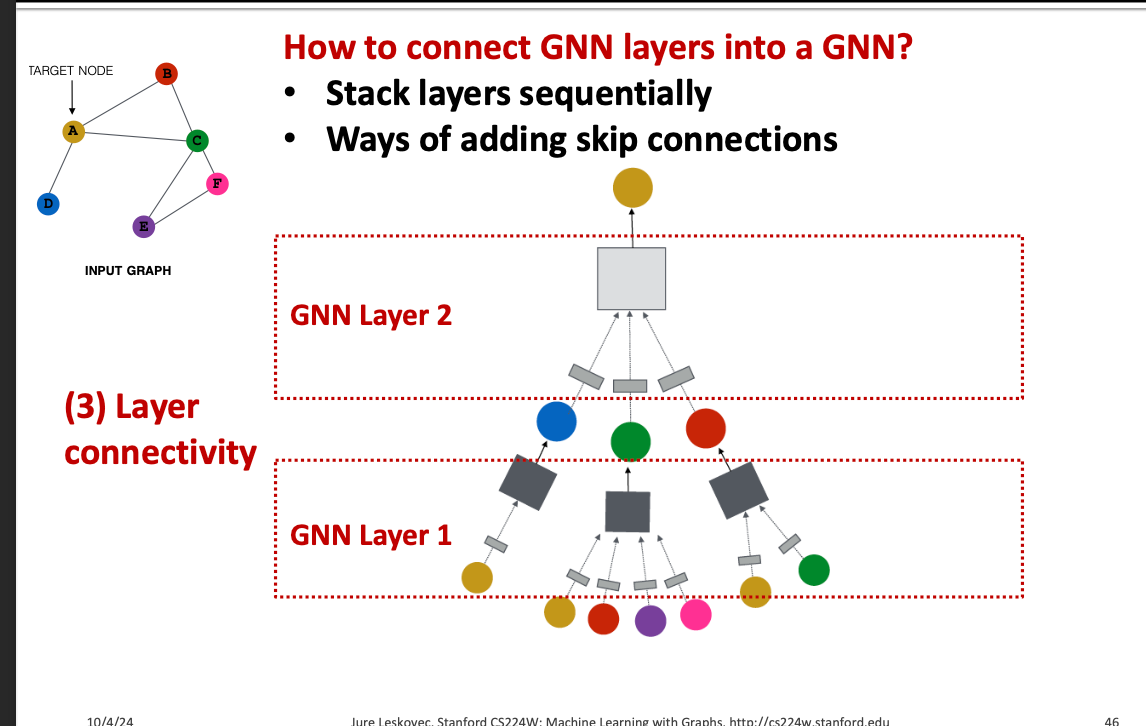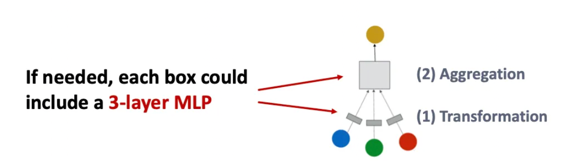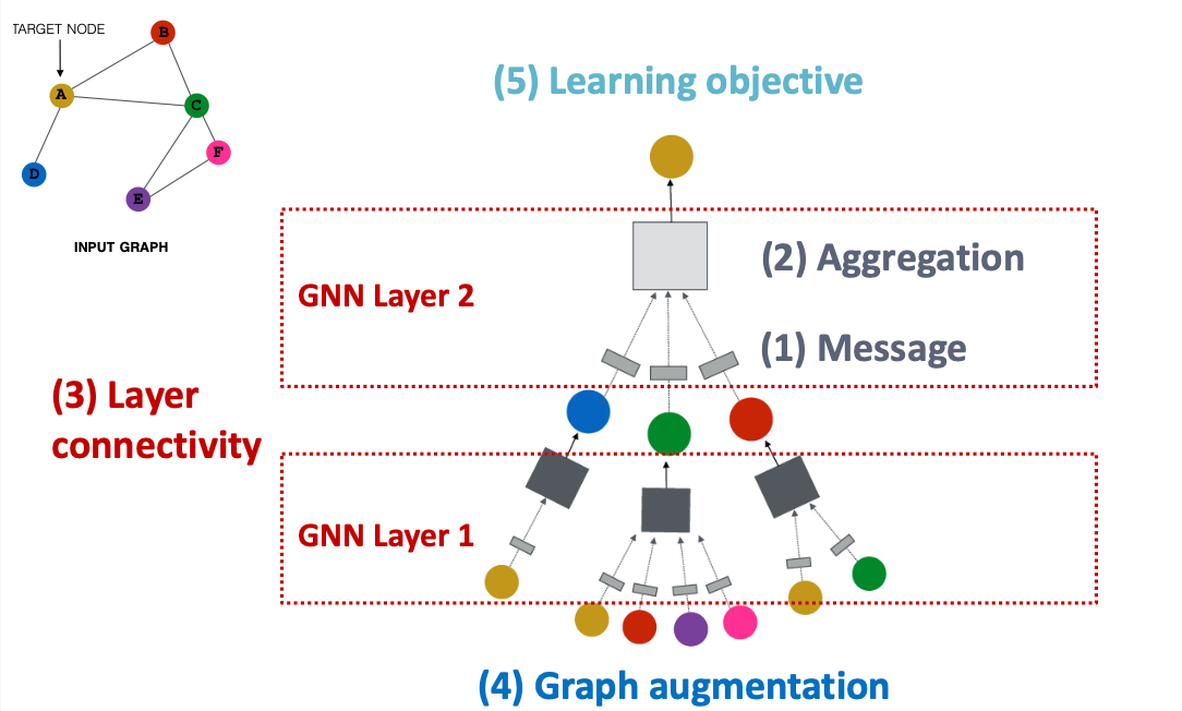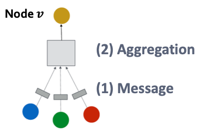 하나의 GNN layer은 세 단계로 구성된다. (1) Message : 각 노드가 자신의 feature로부터 메시지를 계산한다. mu(l)=MSG(l)(hu(l−1)),u∈{N(v)∪v} 이웃 노드 + 자기자신 모두 메시지를 만든다. (2) Aggregation : 이웃 노드들의 메시지를 모아 새로운 표현을 만든다. hv(l)=AGG(l)({mu(l),u∈N(v)},mv(l)) 중심 노드 v는 이웃들의 메시지와 자신의 메시지를 집계해서 새로운 노드 표현 생성