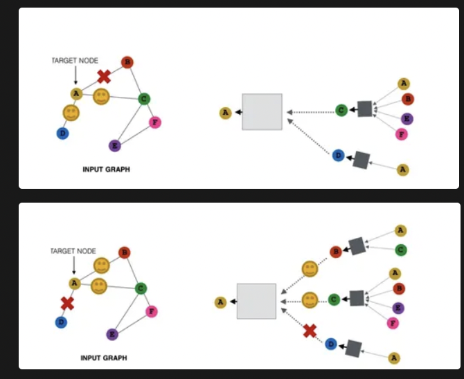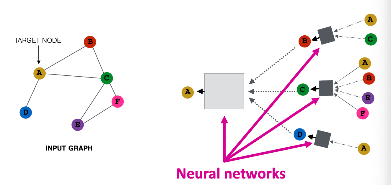 → GNN은 하나의 큰 그래프를 여러 개의 노드별 지역 계산 그래프로 분해하여, 각 노드가 이웃의 정보를 단계적으로 집계하고 학습하는 구조