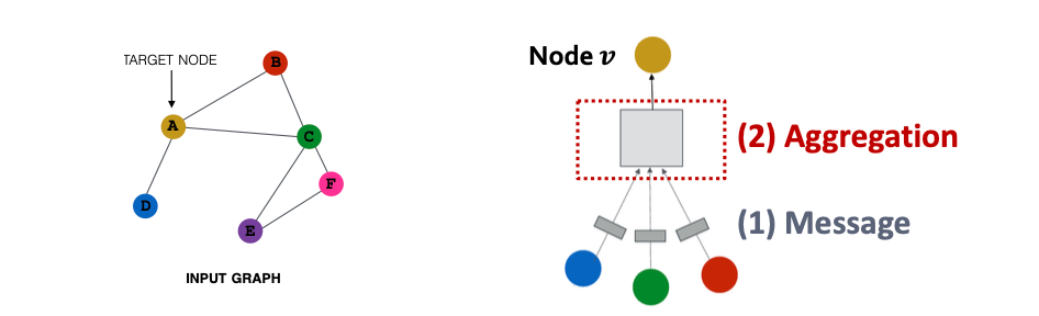 2. Aggregation : 중심 노드가 이웃들로부터 받은 메시지를 통합해서 자신의 새로운 임베딩 생성