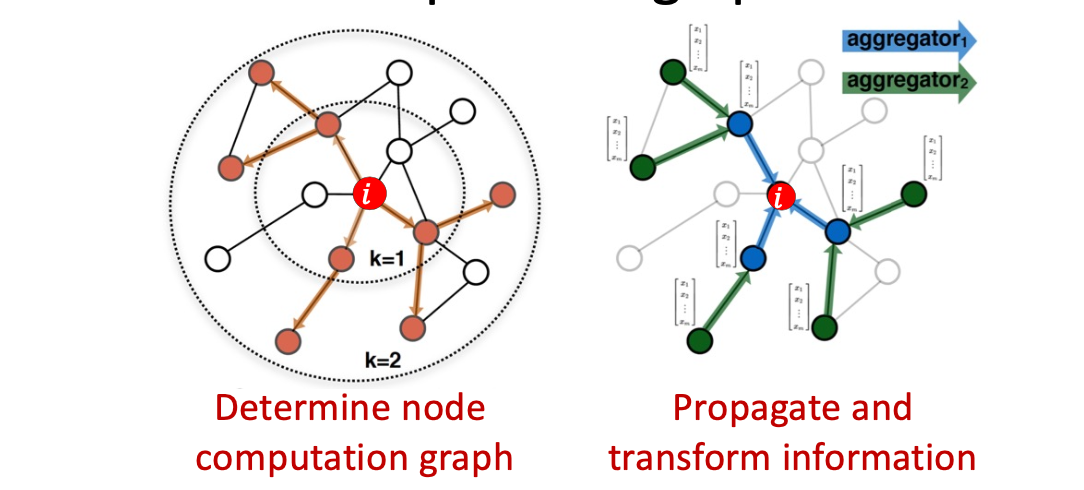 노드 별 계산 그래프 정의 : 중심 노드 i 를 기준으로 k-hop 범위 내의 이웃 노드들이 해당 노드의 정보 업데이트에 참여한다. (k-hop neighborhood)