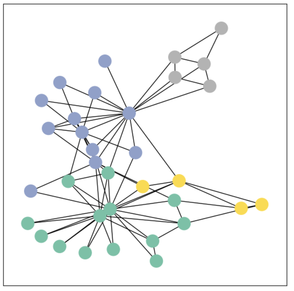 self.classifier = Linear(2, dataset.num_classes) # 마지막 선형 분류기 -> 입력 : 2차원 GNN 임베딩 , 출력 : 데이터셋의 클래스 개수 num_classes (각 노드를 어떤 클래스에 속하는 지 예측하기)