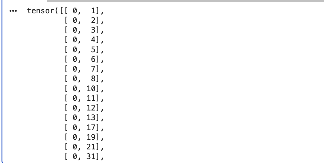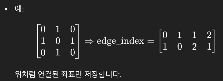 - 전체 adjacency matrix 저장하지 않고, 연결된 노드 쌍만 (row, column) 형태로 저장하는 방식