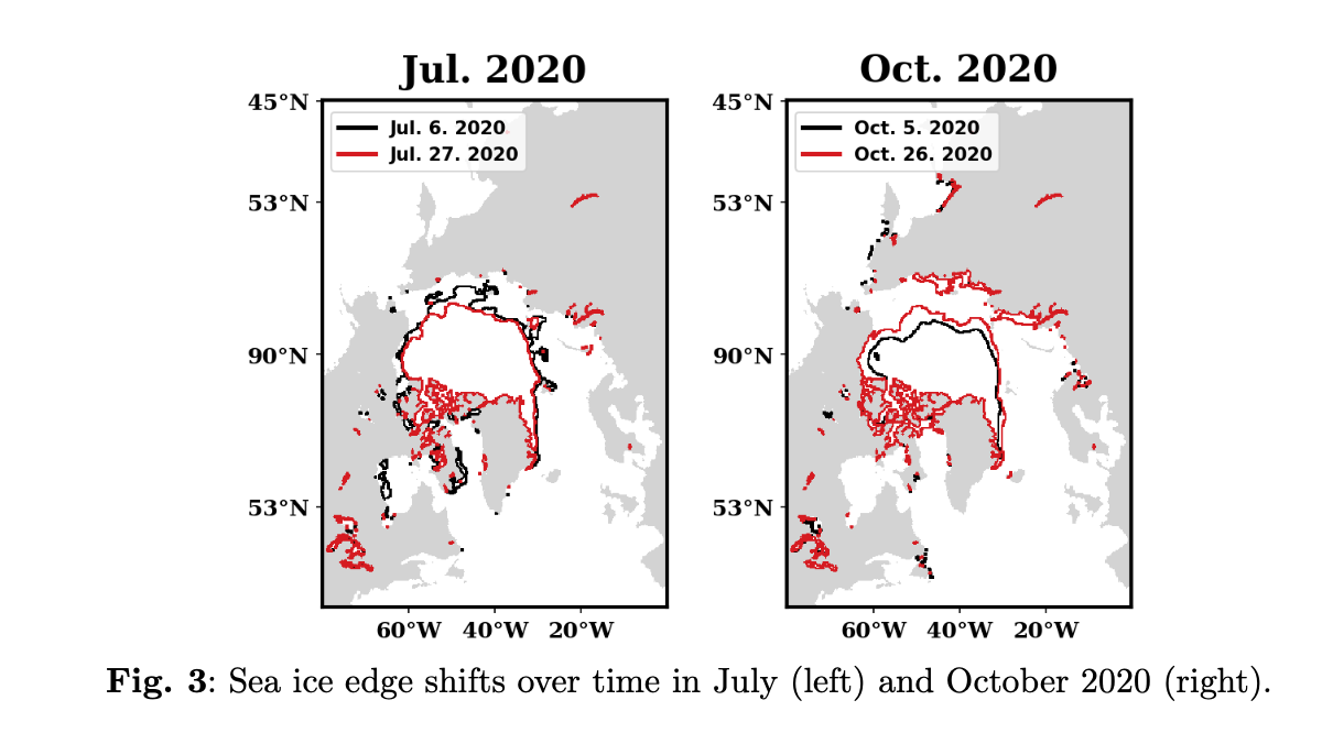 7월의 해빙 경계는 감소 추세일 경우 안쪽으로 이동, 10월 증가 추세일 경우 바깥쪽으로 확장되는 경향