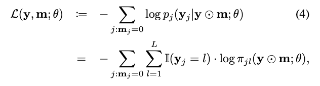 이는 마스킹된 항목의 negative log-likelihood로 정의된다.