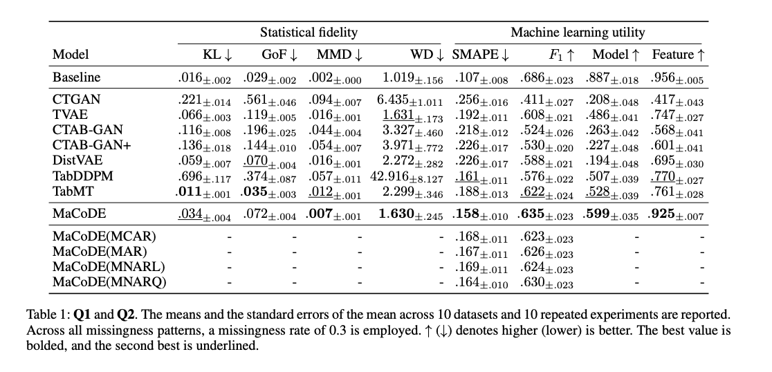 #### Q1. Does MaCoDE acheive state - of - art performance in synthetic data generation? #### Q2. Can MaCoDE generate high-quality synthetic data even when faced with missing data scenarios? #### Q3. Is MaCoDE capable of supporting multiple imputations for deriving statistically valid inferences from missing data?