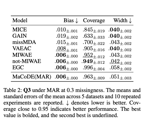 MaCoDE는 bias, coverage, CI 길이 기준으로 모든 비교 모델들과 유사하거나 더 우수한 성능을 보임. -> 이는 결측 데이터부터로의 통계적으로 유효한 추론을 가능하게 한다는 뜻.