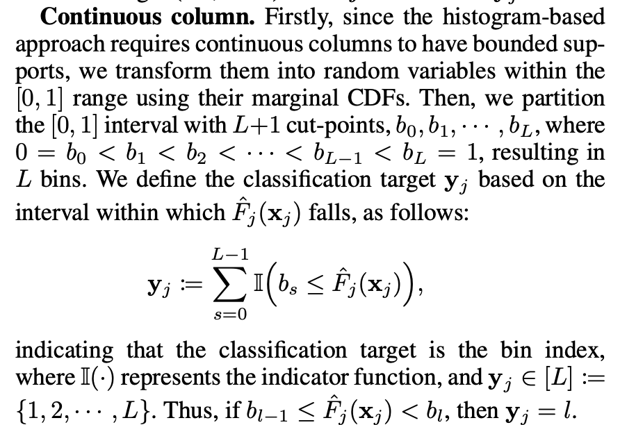 표형 데이터의 이질적인 속성을 고려하고, 연속형 열의 다양한 분포를 모델링하는 데 수반되는 어려움을 해결하기 위해, 우리는 다중 클래스 분류 과제를 기반으로 한 히스토그램 기반 비모수 조건부 밀도 추정 방식을 사용한다.