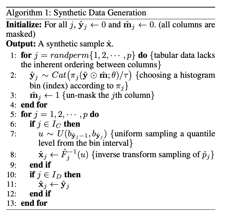 MaCoDE에서 제안하는 알고리즘은 tabular 형식의 데이터 특성을 반영한 합성 데이터 생성 방식을 설명한다. 자연어와는 달리, 표 데이터는 열 간 순서가 존재하지 않기 때문에, MaCoDE는 임의로 섞은 열 순서에 따라 한 번에 하나의 열 씩 데이터를 생성한다.