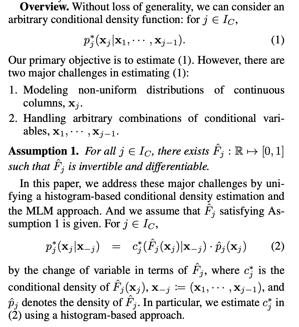 그리고 여기서는 위의 두 문제를 히스코그램 기반 조건부 밀도 추정 방법 + MLM 접근법을 통해 해결.