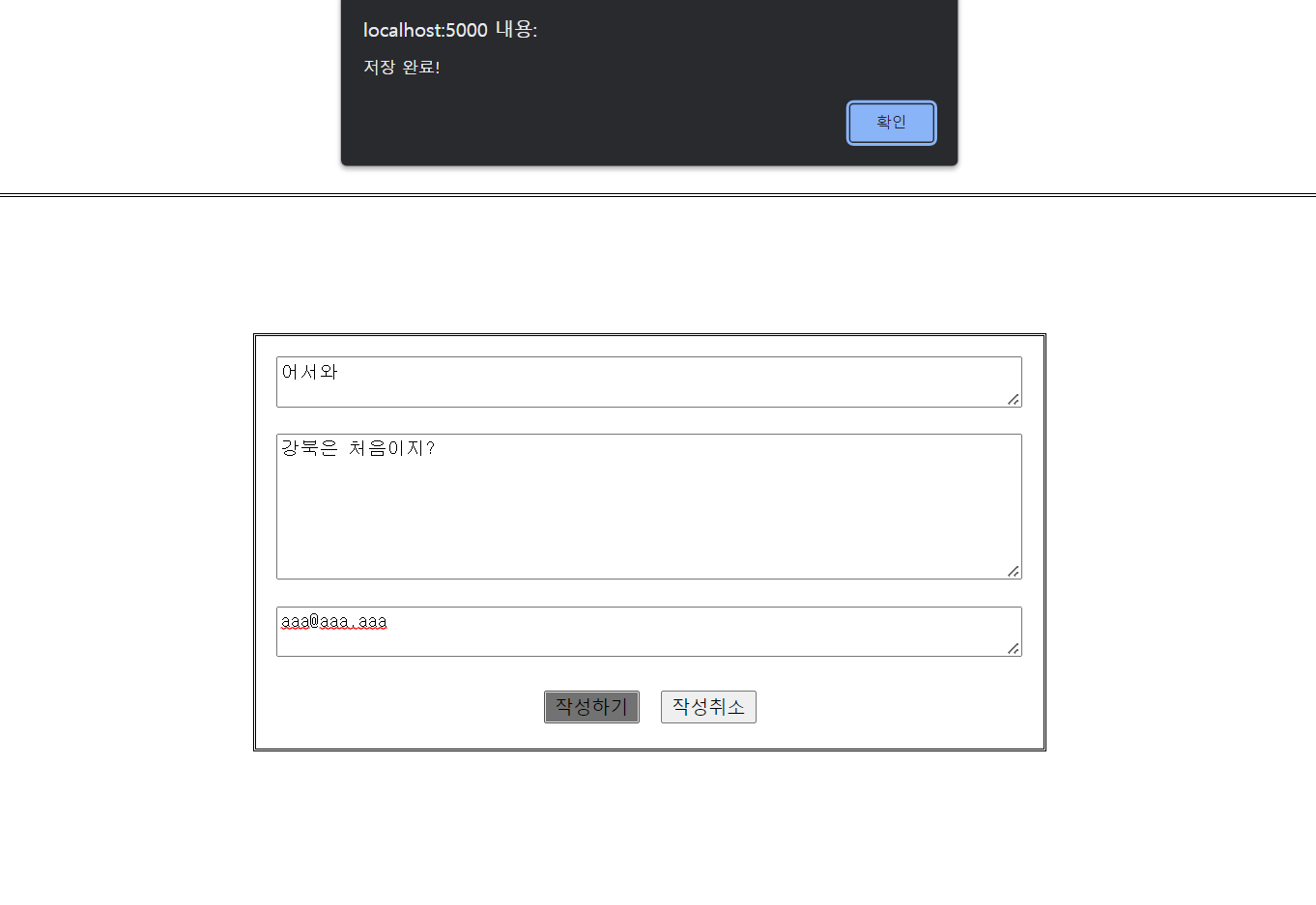 - 아래 화면에 보이듯이 작성하기 버튼을 누르면 저장완료! 라는 알림을 띄워준다.(이제 조원들과 다 합쳐지게 되면 DB서버에 저장을 할 예정이다!)🔽🔽🔽