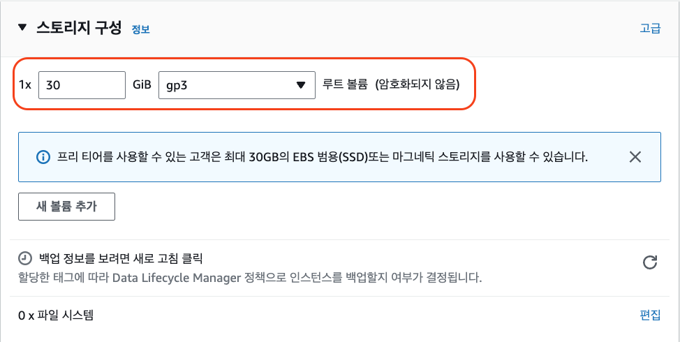 EBS 용량은 초기 생성 시 30GiB로 설정하는 것을 권장합니다. 그 이유는 AWS 프리 티어(Free Tier) 혜택으로 30GiB의 EBS 스토리지를 무료로 사용할 수 있기 때문입니다.