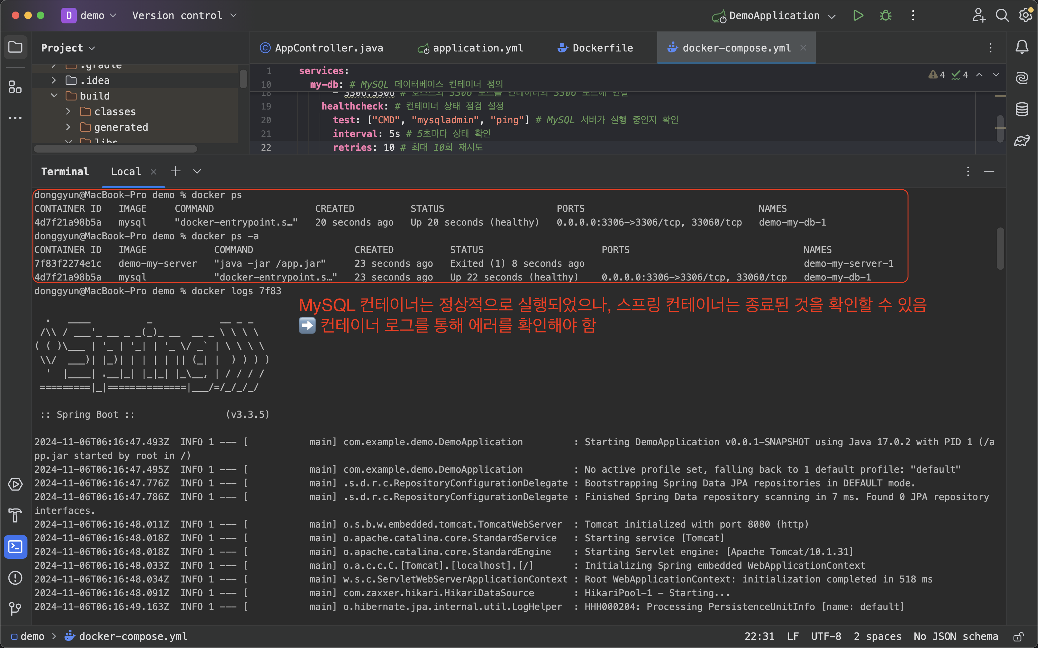 결과를 확인해 보면, MySQL 컨테이너는 정상적으로 실행되었으나, 스프링 부트 애플리케이션 컨테이너는 종료된 것을 확인할 수 있습니다.
