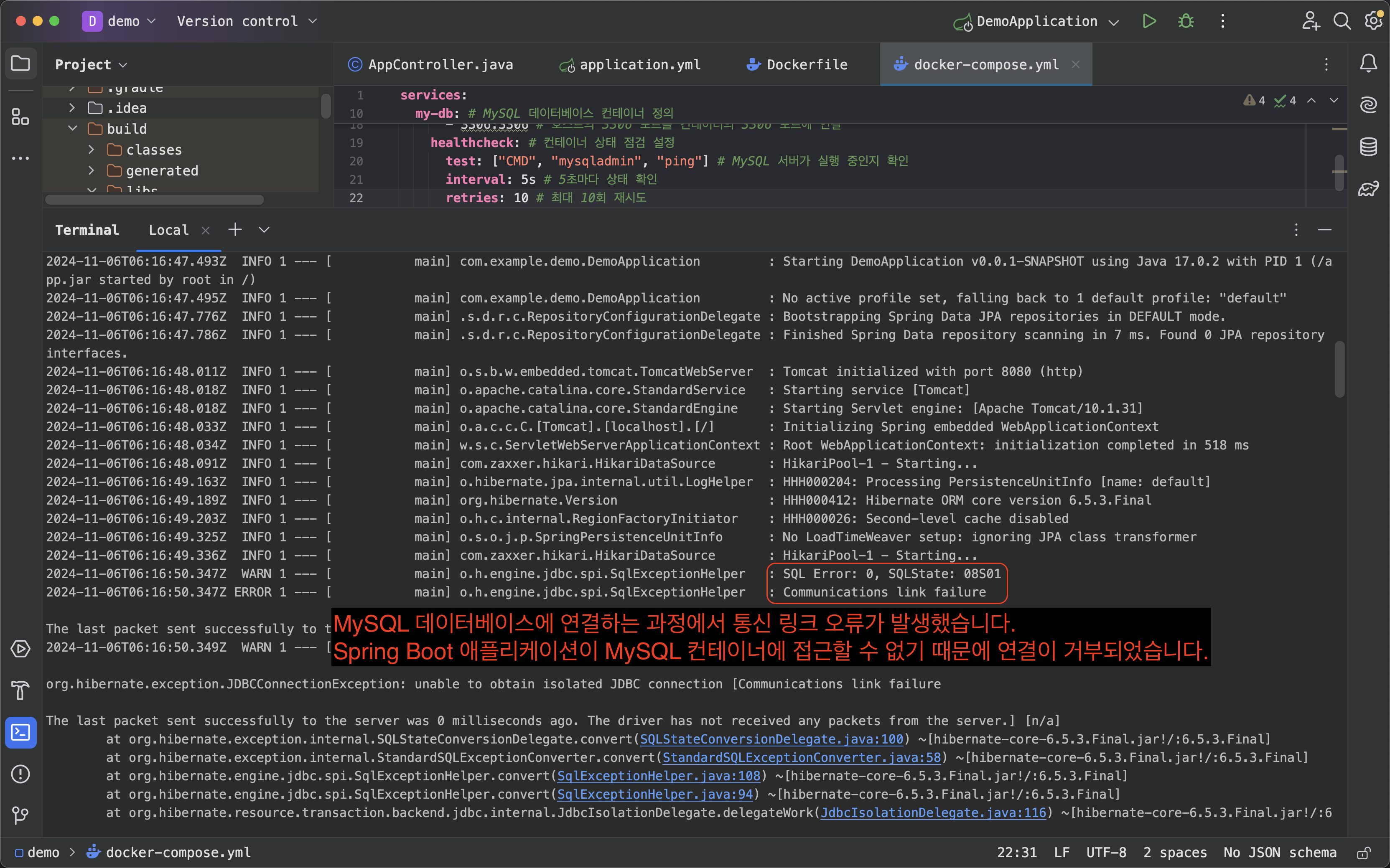- 데이터베이스 연결 우선 요구: Spring Boot 애플리케이션은 시작할 때 데이터베이스와 연결이 필요합니다. 만약 MySQL이 완전히 실행되지 않은 상태라면 연결에 실패해 애플리케이션이 오류를 발생시킬 수 있습니다.