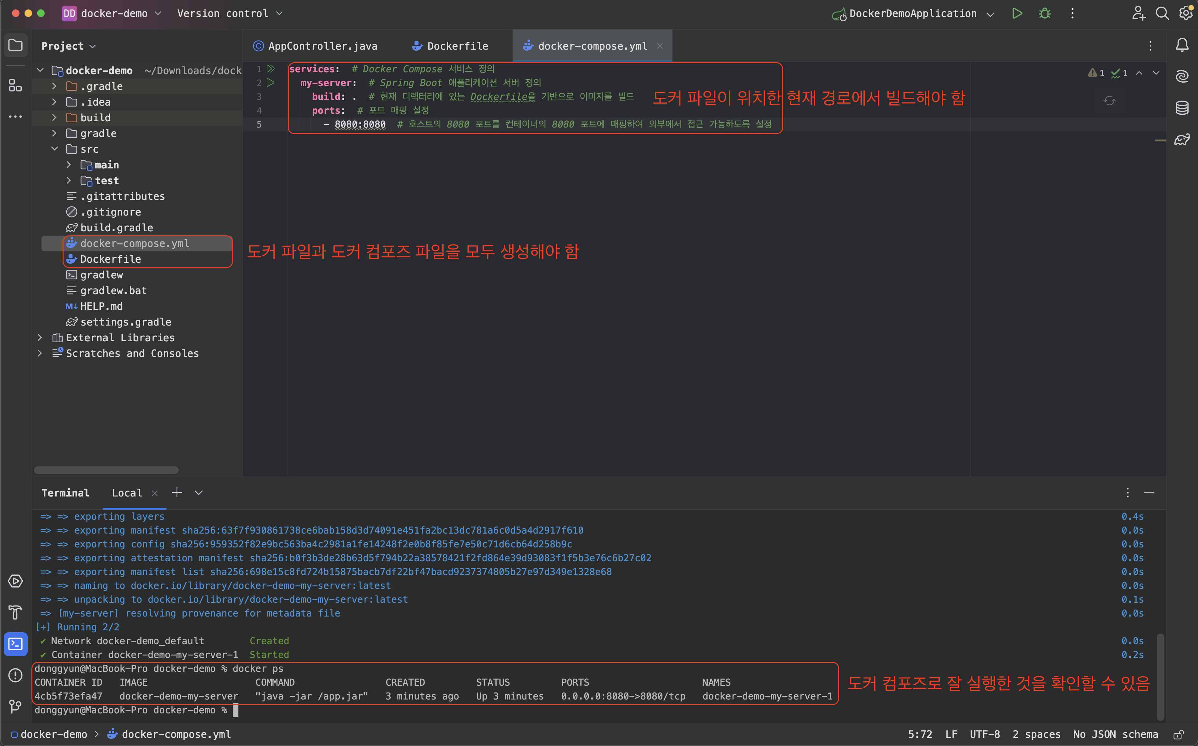 터미널에서 도커 컴포즈 빌드 명령어는 다음과 같이 작성합니다.